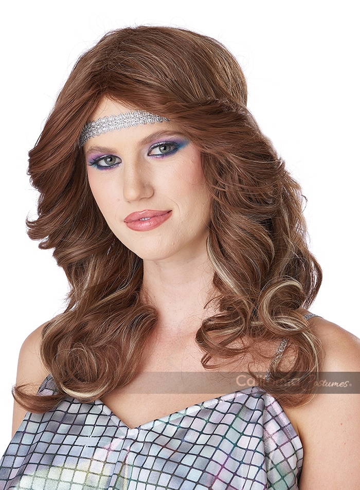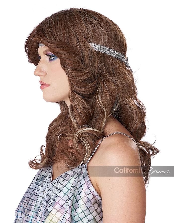 Product Description: Brunette with blonde highlights, Curled feathered medium length Wig. A feathered 70's styled wig that is great at completing a disco period look. The 70's Feathered and Fun Wig is a curled brown and blonde blend wig in a medium long length.