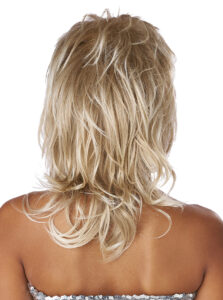 Product Description: Blonde/Brown Blend Medium/Short Wig with short Bangs. An iconic hairstyle of the 70's scene. The 70's Shaggy Chic wig, in a blonde/brown blend, is styled in the shag hair style: wavy teased texture, short fringe/bangs, medium/short length at the sides and nape.