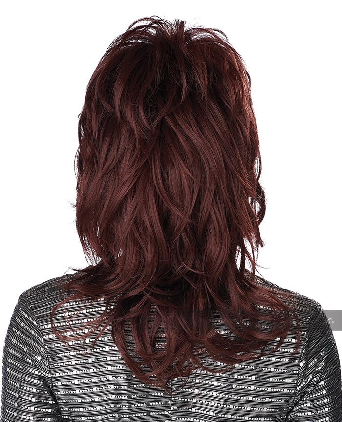 Product Description: Dark Auburn Medium/Short wig with short Bangs. An iconic hairstyle of the 70's scene. The 70's Shaggy Chic wig in, dark auburn, is styled in the shag hair style: wavy teased texture, short fringe/bangs, medium/short length at the sides and nape.