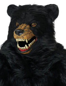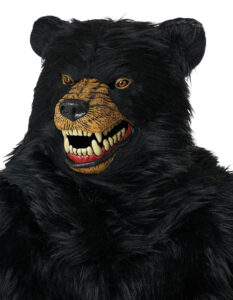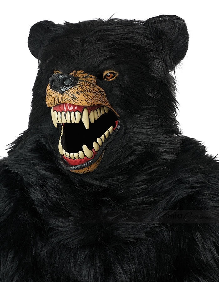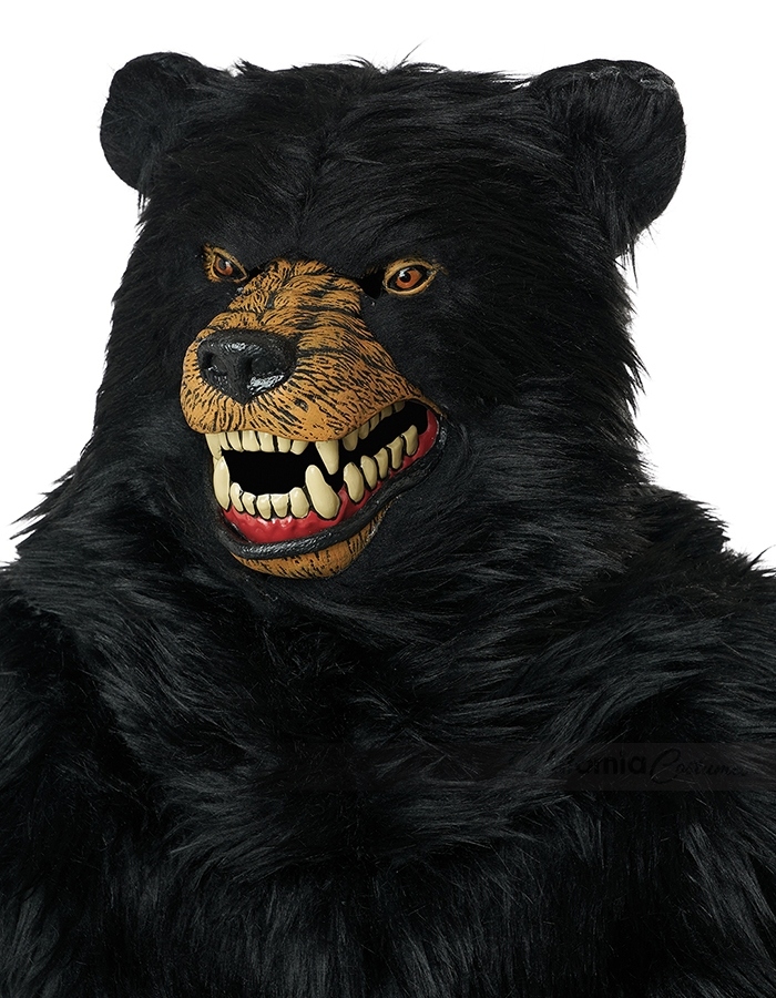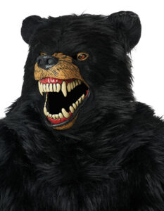 Product Description: Motion mask opens and closes with the wearer's jaw motion. Includes foam blocks to stick inside for fitting. Motion Mask has a plastic inner shell and foam rubber skin. Attached faux fur hood. Large sized mask: Top to bottom 9 4/5" inches - Width at temple 7 3/5" inches. Use foam blocks for fit and function. Don't feed the bears. This Black Bear Motion mask features mouth moving action. The mask opens and closes with the wearer's jaw motion. Includes foam blocks to stick inside for fitting. Foam top layer with hard plastic under shell. Attached brown faux fur.