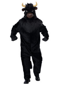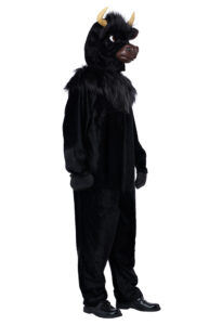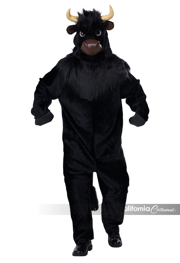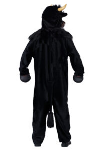 Product Description: Jumpsuit made of short pile fabric. Features an attached faux fur collar "mane" that covers the front and back of neck. Attached: tail, hand "hoof covers". Hoof sleeves have slip openings to put hands through. Suit closes in back, neck to waist, with two string ties. Bull Mask made of an inner plastic shell and fabric over layer with attached hood. Faux fur fabric covers the forehead. Snout section of mask is layered with foam. Adjustable strap at the back. Horns and ears are attached. Large sized mask: inside mask length top to bottom 9 3/4" inches. Width at temple 7 4/5" inches. Like a bull in any type of market you want. The Bull costume is a jumpsuit costume with mask. The jumpsuit is made of short pile fabric and has a faux fur collar around the front and back of neck. Attached to suit: tail and hoof "hand" covers. The bull mask is a plastic shell covered with a fabric hood. Adjustable strap in back.