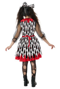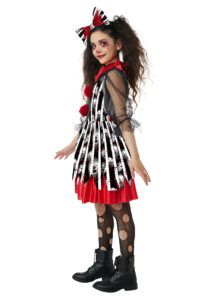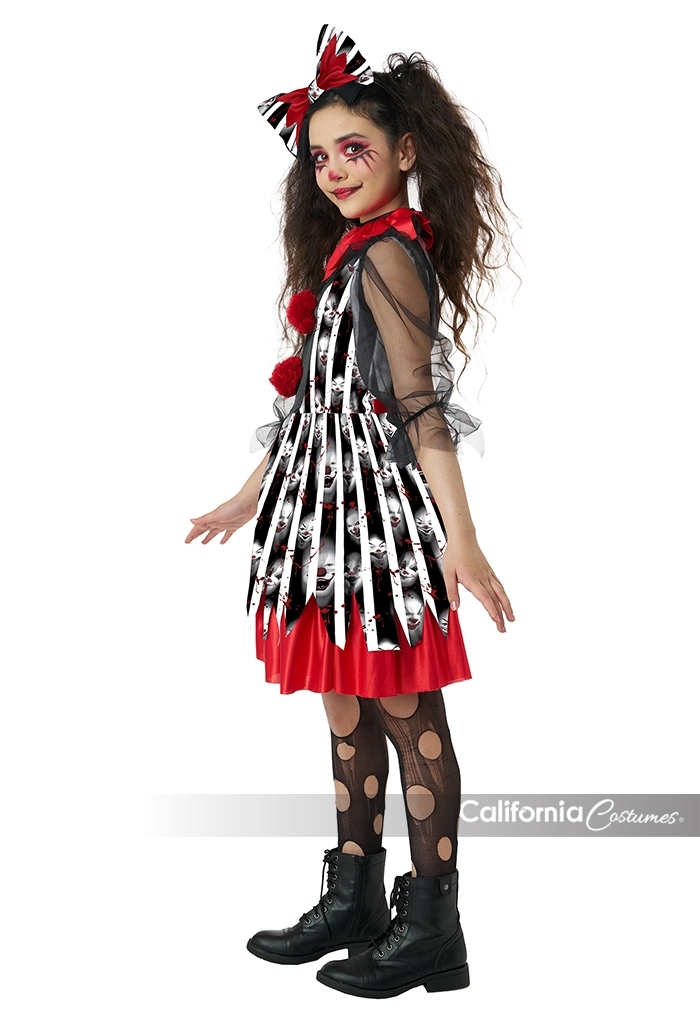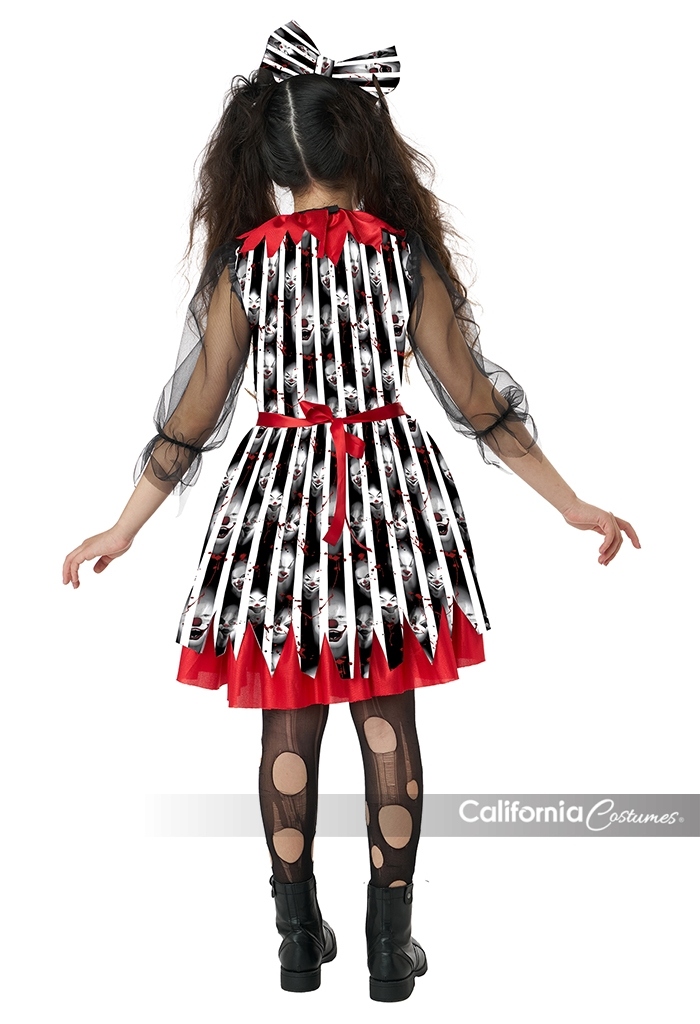 Product Description: Dress with mesh sleeves, features a jagged skirt hemline, and two red pom poms. Closes in back of the neck with a hook-and-loop closure. Ribbons on the side of waist can be cinched in back. Includes a pettiskirt with vibrant red trim. Adds volume and lift to the skirt Layered collar with red and black mesh fabric. Hook and loop closure. Headband comes with a matching bow insert. It's showtime with this frightfully fun circus look. The Deranged Clown child dress costumes features black and white stripe fabric print along with eerie clowns faces. Costume includes: Dress, Collar, Pettiskirt, Headband with Bow