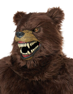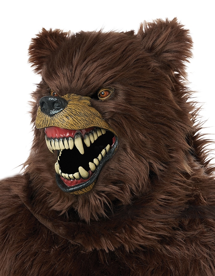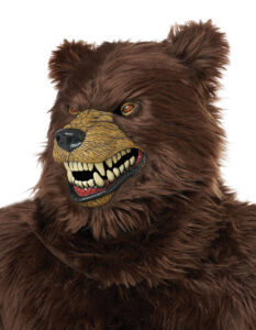 Product Description: Motion mask opens and closes with the wearer's jaw motion. Includes foam blocks to stick inside for fitting. Motion Mask has a plastic inner shell and foam rubber skin. Attached faux fur hood. Large sized mask: Top to bottom 9 4/5" inches - Width at temple 7 3/5" inches. Use foam blocks for fit and function. This Grizzly Bear Motion mask brings the beast to life with mouth moving action. Motion mask opens and closes with the wearer's jaw motion. Includes foam blocks to stick inside for fitting. Foam top layer with hard plastic under shell. Attached brown faux fur.