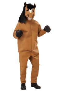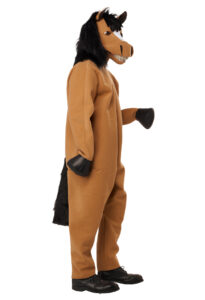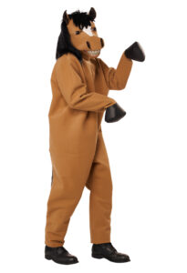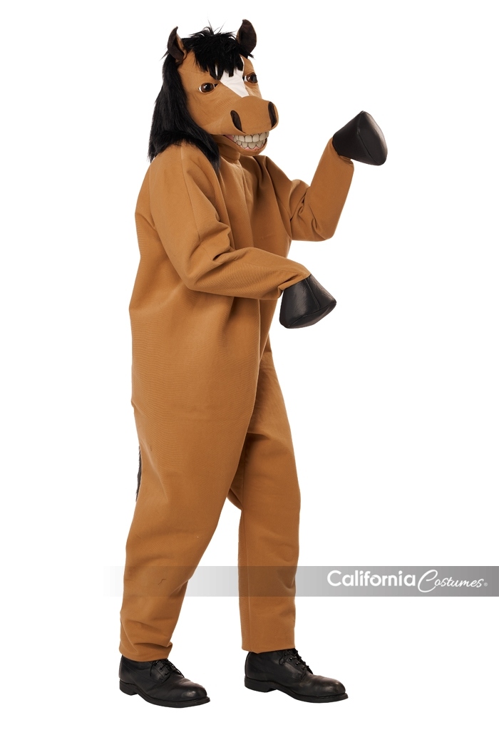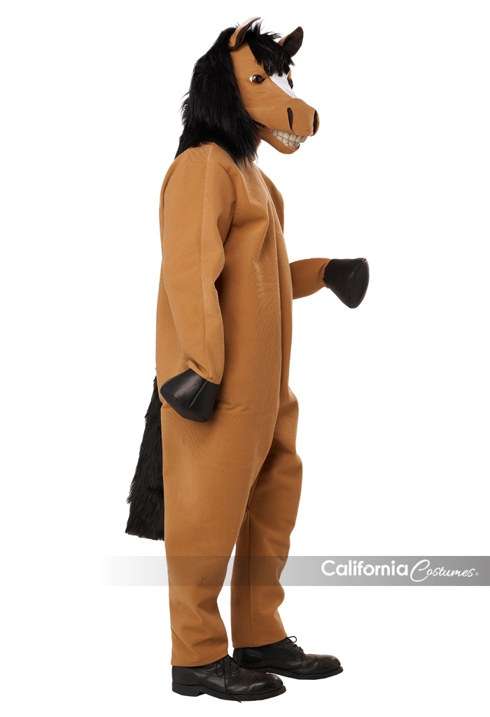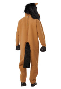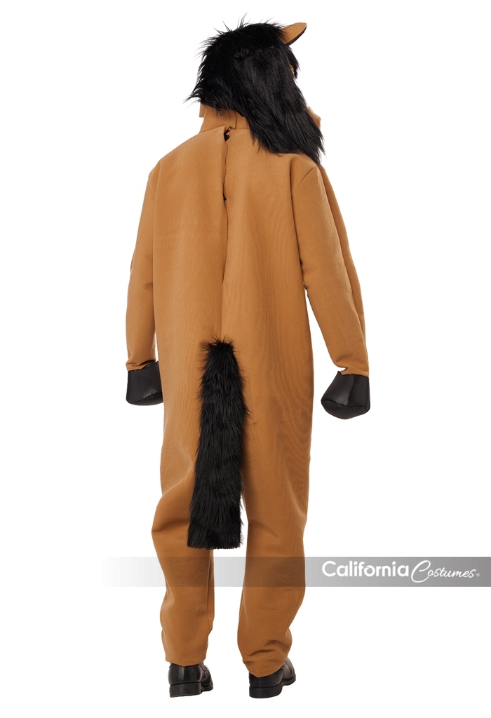 Product Description: Jumpsuit with textured suede; attached hand "hoof" covers. Sleeves have side openings to slide hands through. Faux fur fabric tail attached. Suit closes in back, neck to small of back, closes with one tie. Movable Mouth Mask. The Mask's mouth and "lips" open and close with the wearer's jaw movement. Inside mask shell is made of plastic with hinged jaw . Fabric over skin hood with attached black plush "mane". X-Large sized mask : inside mask length top to bottom 10" inches. Width at temples 7 5/6" inches. Comes with foam blocks to adjust fit. Adjustable straps at the back. A lot of equestrian energy. The Horsing Around, Horse Costume is a jumpsuit and motion mask. Jumpsuit is made of a textured fabric with attached tail and "hoof" hand covers. There are side openings in the sleeves to slip your hands through. Suit closes at the back. Horse Motion mask open's and closes with the wearer's jaw movement. Inside mask shell is made of plastic with hinged jaw. Fabric over skin hood with attached black plush "mane". Adjustable straps at the back. X-Large Sized mask see size details.