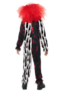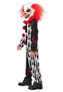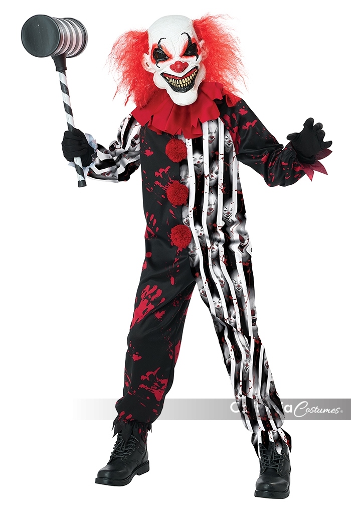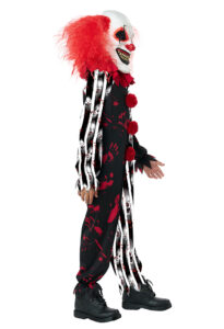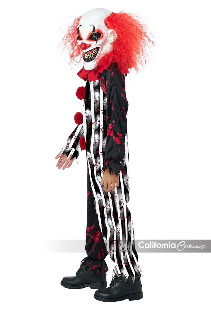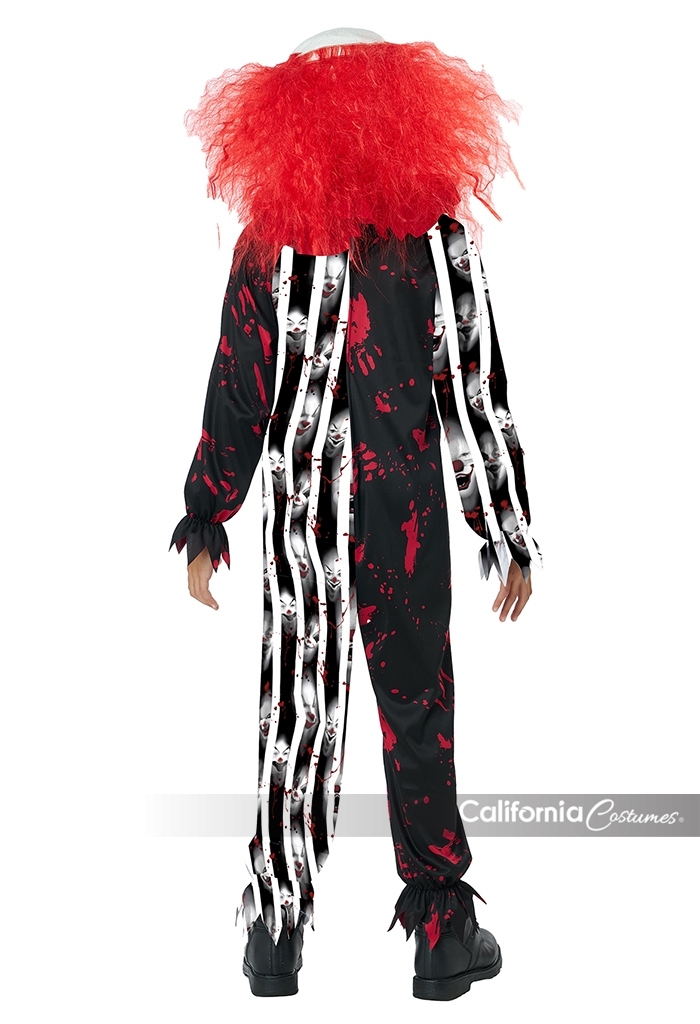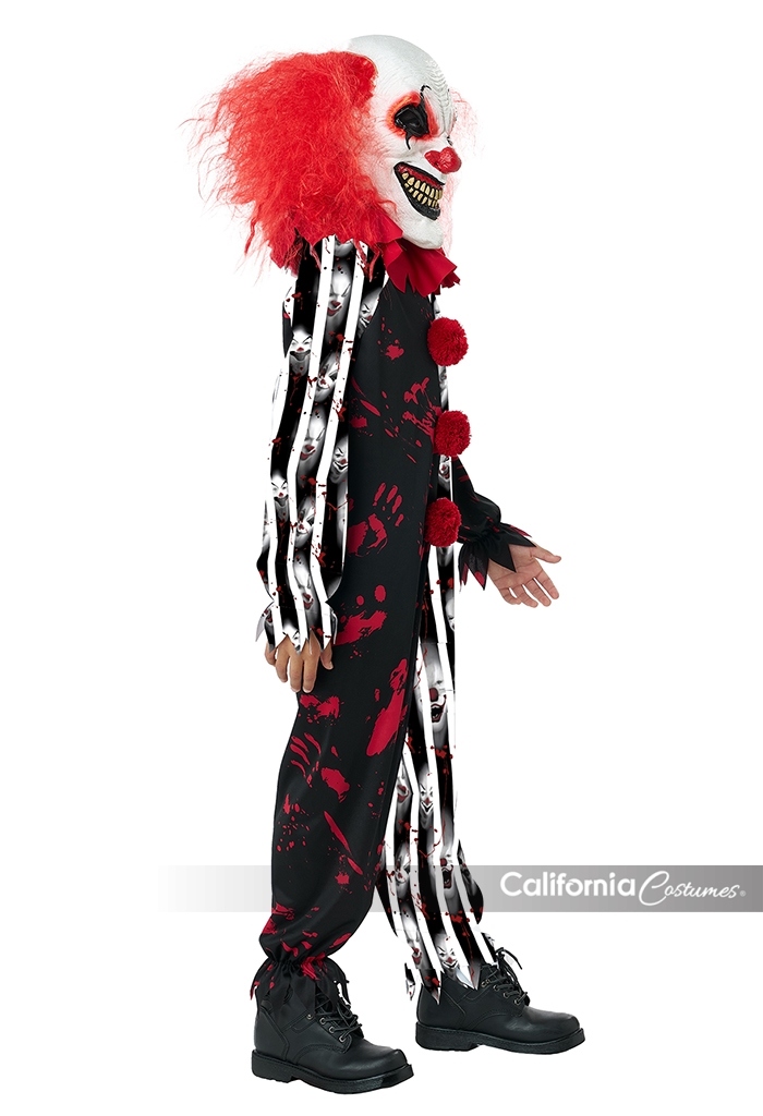 Product Description: Jumpsuit with attached pom poms featuring scary clown fabric print. Closes at back of neck with hook and loop fastener Red Collar with backing, closes with hook and loop fastener Mask (front half) with attached wig hair. Elastic Band in back Turn smiles into screams with this Manic Clown child costume. Costumes comes with jumpsuit, collar, and mask! Jumpsuit has attached pom poms and is decorated with scary clown fabric print. Front half mask is decorated with attached wig hair.