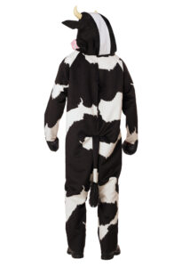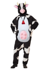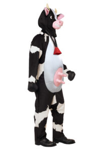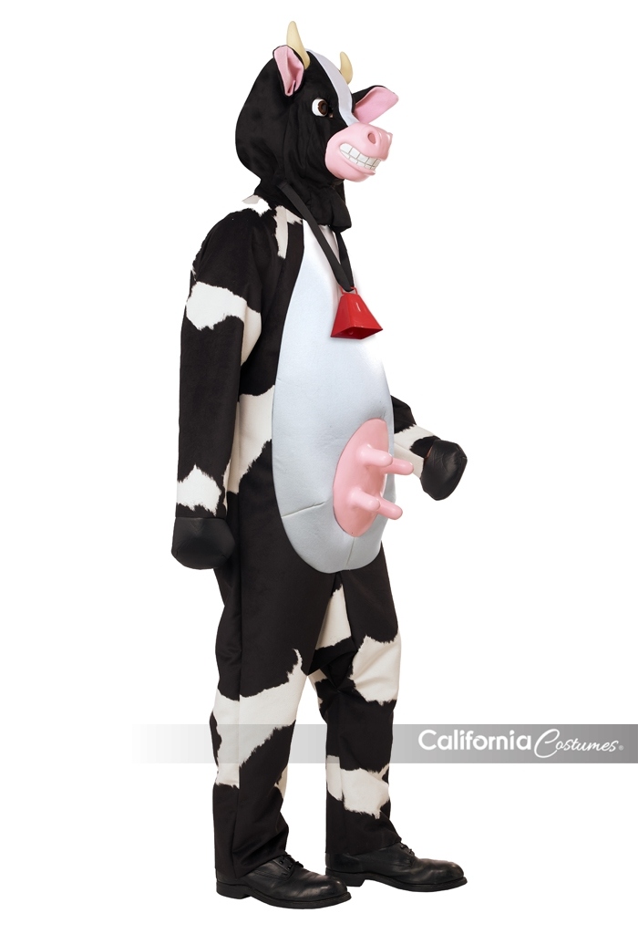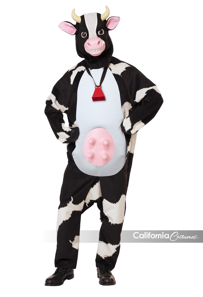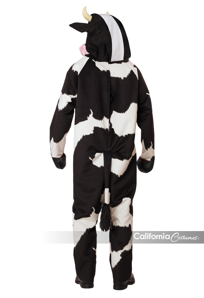 Product Description: Jumpsuit with a foam backed belly panel; attached utter, tail, and hand "hoof" covers. Hoof sleeves have slip openings to put hands through. Suit closes in back, neck to waist, with two string ties. Cow Mask made of an inner plastic shell and fabric over layer with attached hood. Snout section of mask is layered with foam. Adjustable strap at the back. Horns and ears are attached. Large/Medium sized mask: inside mask length top to bottom 9 1/2" inches. Width at temple 7 1/2" inches. Cow bell on ribbon. Milk time! Moo-Larious, Cow Costume is jumpsuit with mask and cow bell accessory. The jumpsuit has a dairy cow print with attached utter, hand "hoof" covers and tail. The belly panel is backed with foam to add extra body to the suit. It ties close at the back. The cow mask is a plastic shell covered with a fabric hood. Adjustable mask strap in the back.
