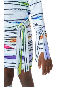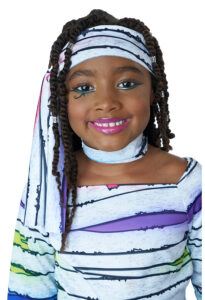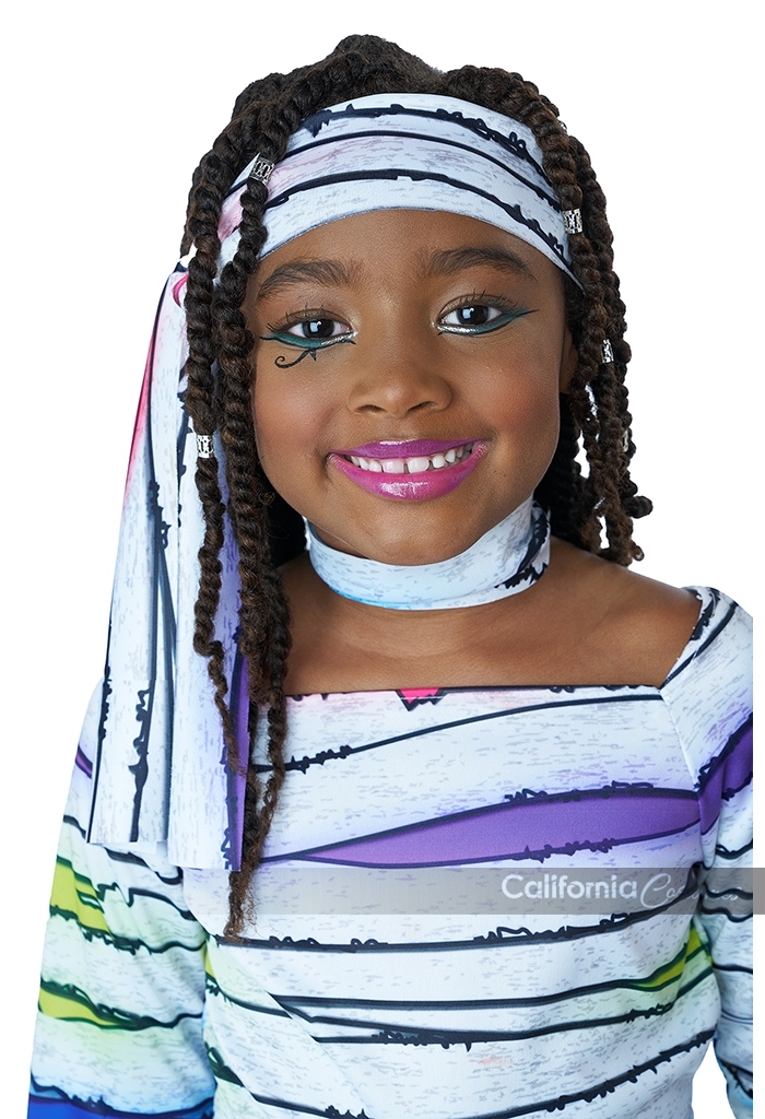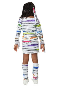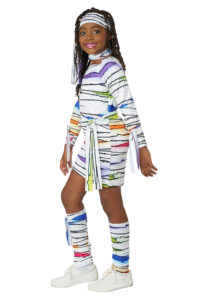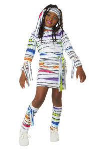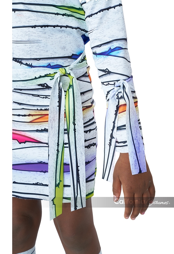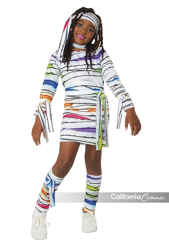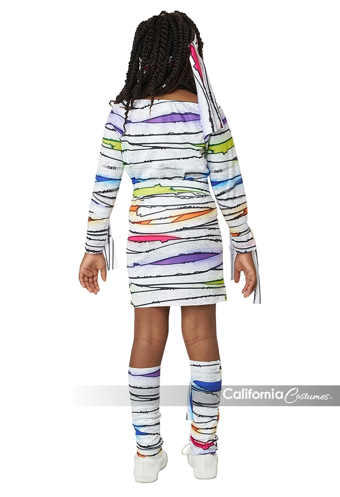 Product Description: Dress with colorful wrap print. Fabric has a light sheen to it. Includes matching fabric components: 1 head tie, 1 waist tie, 2 arm ties, 2 leg warmers/wraps, 1 leg tie, 1 collar with hook and loop fastener. Dress is pull over Wrapped in color and ready to wow! The Child neon mummy costume is made of a shiny white fabric printed with bandage artwork with pops of bold vibrant colors. Included components: dress, head tie, waist tie, pair of arm ties, pair of "leg warmers" wraps, 1 leg tie, 1 collar piece.