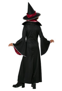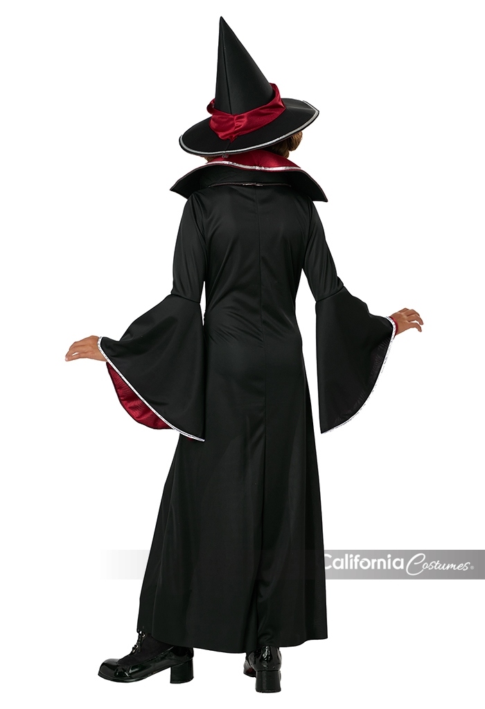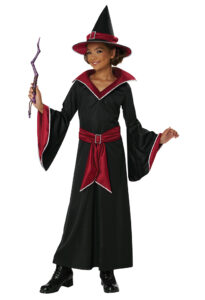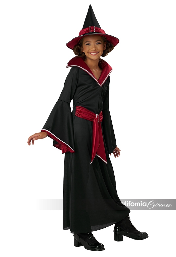 Product Description: Dress features a collar and flared sleeves lined with red for a pop of enchantment. Collar is made of foam for structure. Belt is attached to dress and ties across the front side only. Comes with buckle decorated with plastic gems. Hat with red sash and attached shiny buckle. The Ruby Red Glamour Witch child costume is perfect for any young spell-caster ready to stir up Halloween fun. This costume dress features a bold red collar and dramatic flared sleeves with red lining. The belt is attached to the front side of the dress and comes with a decorated buckle. The witch hat comes with a matching red sash and buckle.