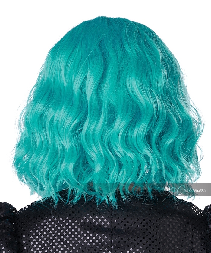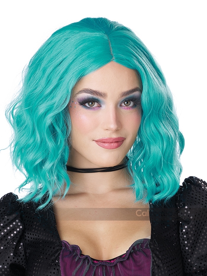 Product Description: Medium Short, Blue Turquoise Wavy Bob Wig. Whether you're channeling a whimsical fairy, a dazzling rave queen, a mysterious enchantress, or any other fantasy being your imagination dreams up, this wig brings your character to life with sparkle and style. This wig is a wavy bob style with parted bangs, made of turquoise fibers. Has a soft plastic inset at the "hair part" in a light medium skin tone.