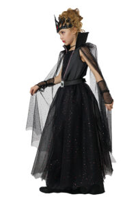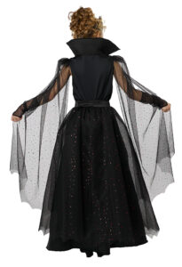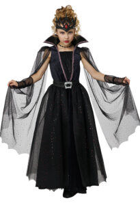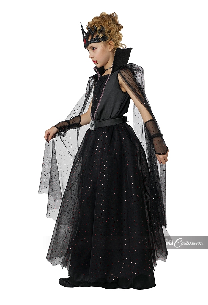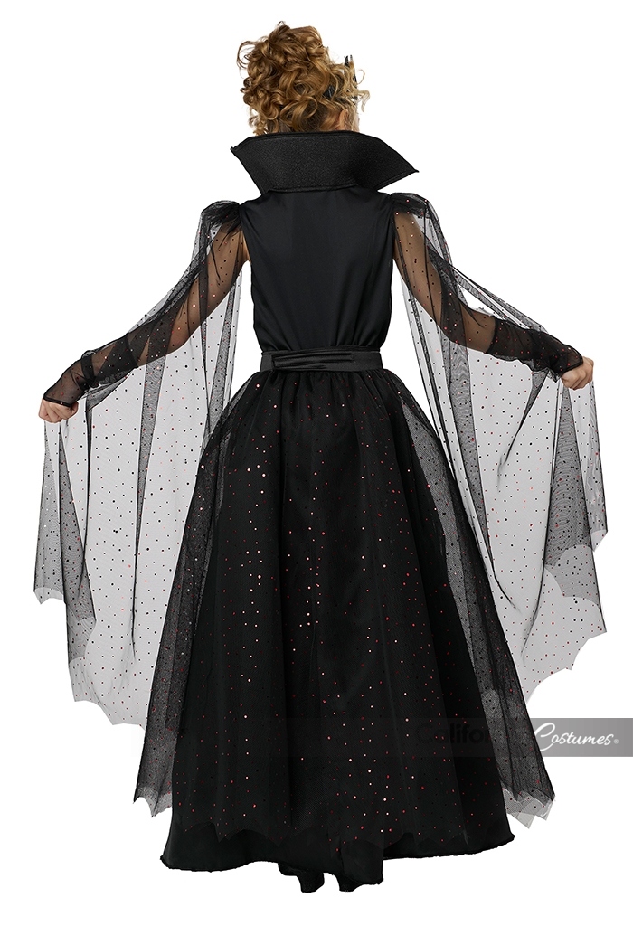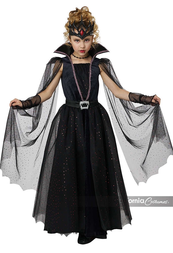 Product Description: Dress decorated with red trim, it features a high low skirt, a dramatic high back collar and a pair of attached flowing cape sleeves. Belt with attached overskirt. Belt is decorated with vampire fang buckle and closes with hook and loop fastener. Fabric mesh is decorated with red sequins. Pair of glovelettes with matching mesh fabric. Vinyl plastic headband with elastic bands in back This Vampire Queen child costume is perfect for the little ruler of the night who loves a touch of sparkle and drama. Costume is a soft velour dress featuring a high-low skirt and a tall regal collar which adds a dash of mysterious flair. Additionally it comes with a belt with attached overskirt and decorative vampire buckle, a pair of glovelettes and a plastic vinyl headpiece with elastic band.